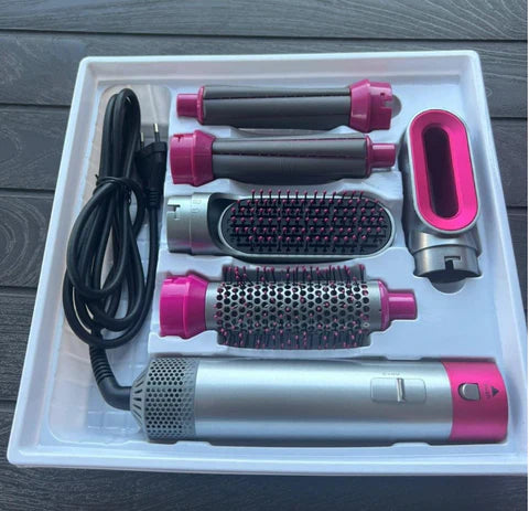 Incluye 5 accesorios intercambiables: dos barriles rizadores (dirección izquierda y derecha), un cepillo alisador, un cepillo moldeador redondo y una boquilla concentradora para secado.